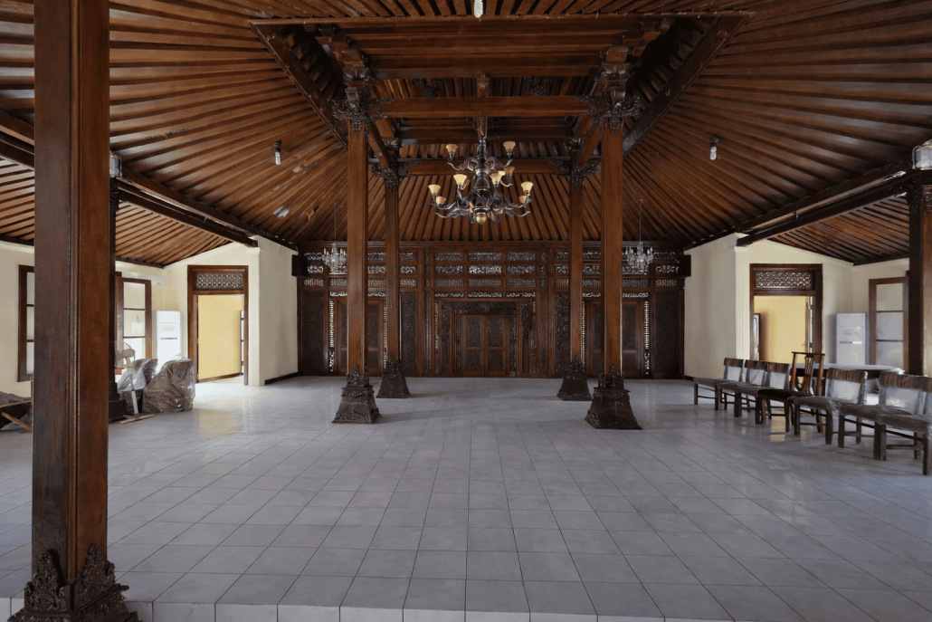 Sementara itu, bagian interior tetap mempertahankan keaslian material kayu, tiang saka guru, serta ukiran khas Jawa yang menjadi identitas utama Djoglo Tjondro Kirono. Penataan ruang aula utama diarahkan agar dapat difungsikan secara optimal sebagai wedding venue bernuansa tradisional, yang menghadirkan suasana sakral, hangat, dan elegan bagi penyelenggaraan acara pernikahan.